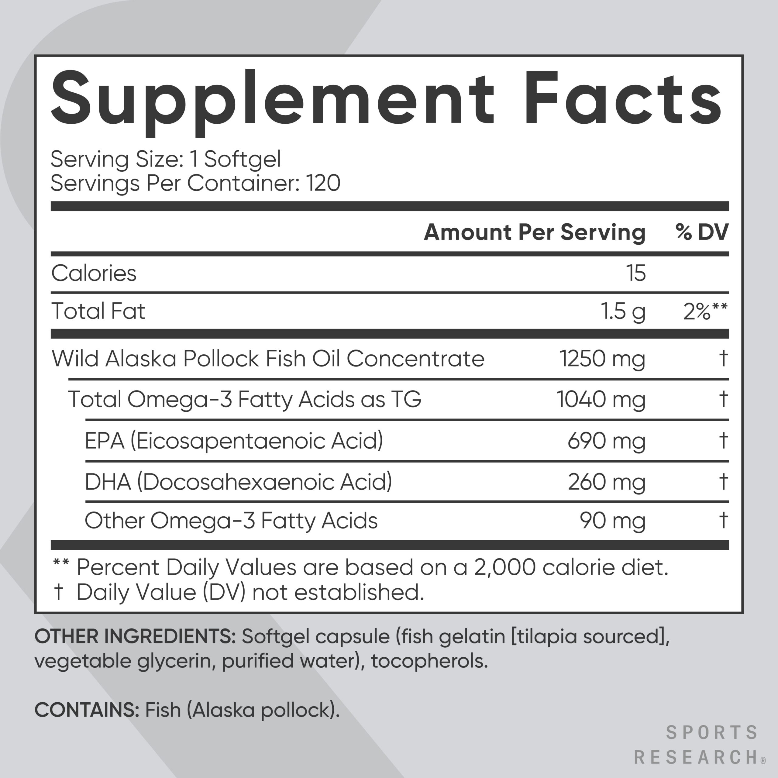 Sports Research Triple Strength Omega 3 Fish Oil is a powerful supplement that provides a concentrated dose of essential omega-3 fatty acids. It is made from Wild Alaskan Pollock, ensuring a high-quality and sustainable source of omega-3 oils, and is manufactured in a cGMP-certified facility in the USA.