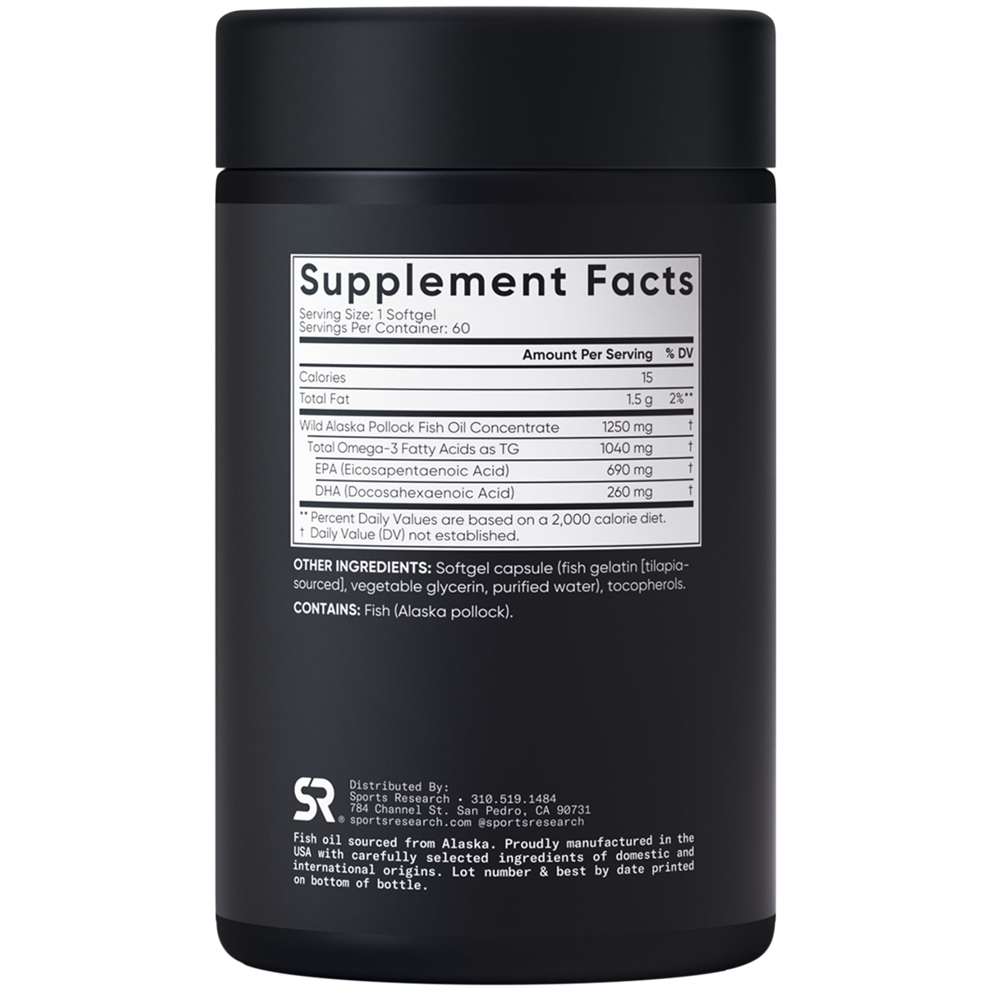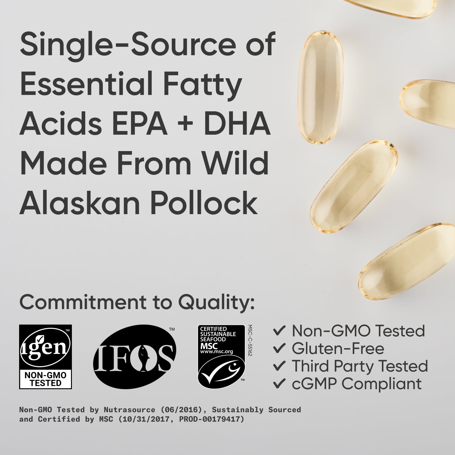 - Fish oil sourced from sustainable Wild Alaskan Pollock
