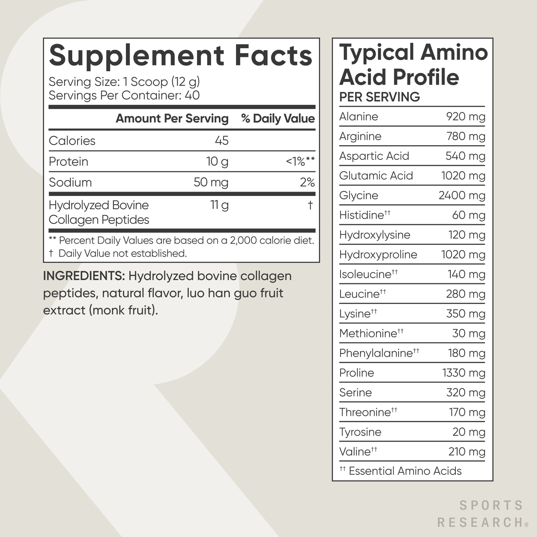 Meet your new morning ritual! Sports Research® Collagen Peptides is hydrolyzed so it combines into your favorite beverage and is more readily absorbed. Collagen is the most abundant protein in the human body, but did you know our bodies produce less and less as we age? This results in everything from wrinkles to joint issues and so much more. Having enough collagen ensures optimal function of everything from hair, skin and nails to joint health. With 11 grams of Type I & III collagen peptides per scoop and 18 amino acids— Sports Research® Hydrolyzed Collagen Peptides is the perfect workout recovery support so you can enjoy your Sport of Life longer and look your best doing it.*