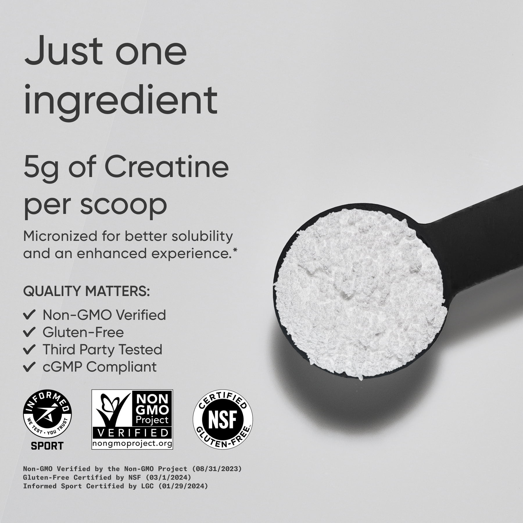 • ATHLETE TRUSTED: Our creatine is Non-GMO Project Verified, Informed Sport Tested for banned substances, and Third-Party tested for quality and purity. It’s made without soy, gluten, or artificial ingredients—so you get only what you need, and nothing you don’t.