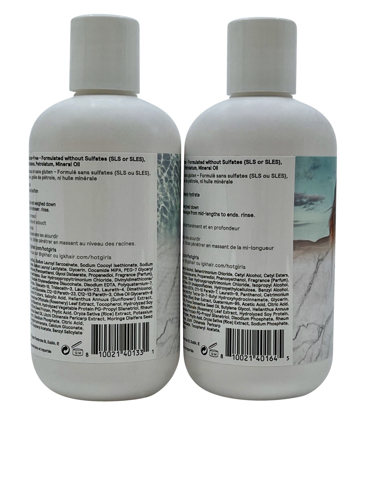 IGK Hot Girls Hydrating Shampoo & Conditioner Set offers your hair anti dryness and dullness protection. Made for all hair types. Lightweight moisture, high shine and boosted manageability. This is a vegan, cruelty free, paraben free, sulfate free, and mineral oil free product. When caring for your hair or creating a daily hair care routine, it is always important to keep certain things in mind. Wash hair less often. Over washing can cause dryness, dullness, irritate scalp and breakage. Use gentle shampoos that are sulfate free or that use mild sulfates. Unless you have oily hair, which sometimes requires a deeper cleansing. Use a daily hair conditioner and weekly hair mask to treat any special area of concern with your hair such as dryness, breakage, color protection, volumizing.