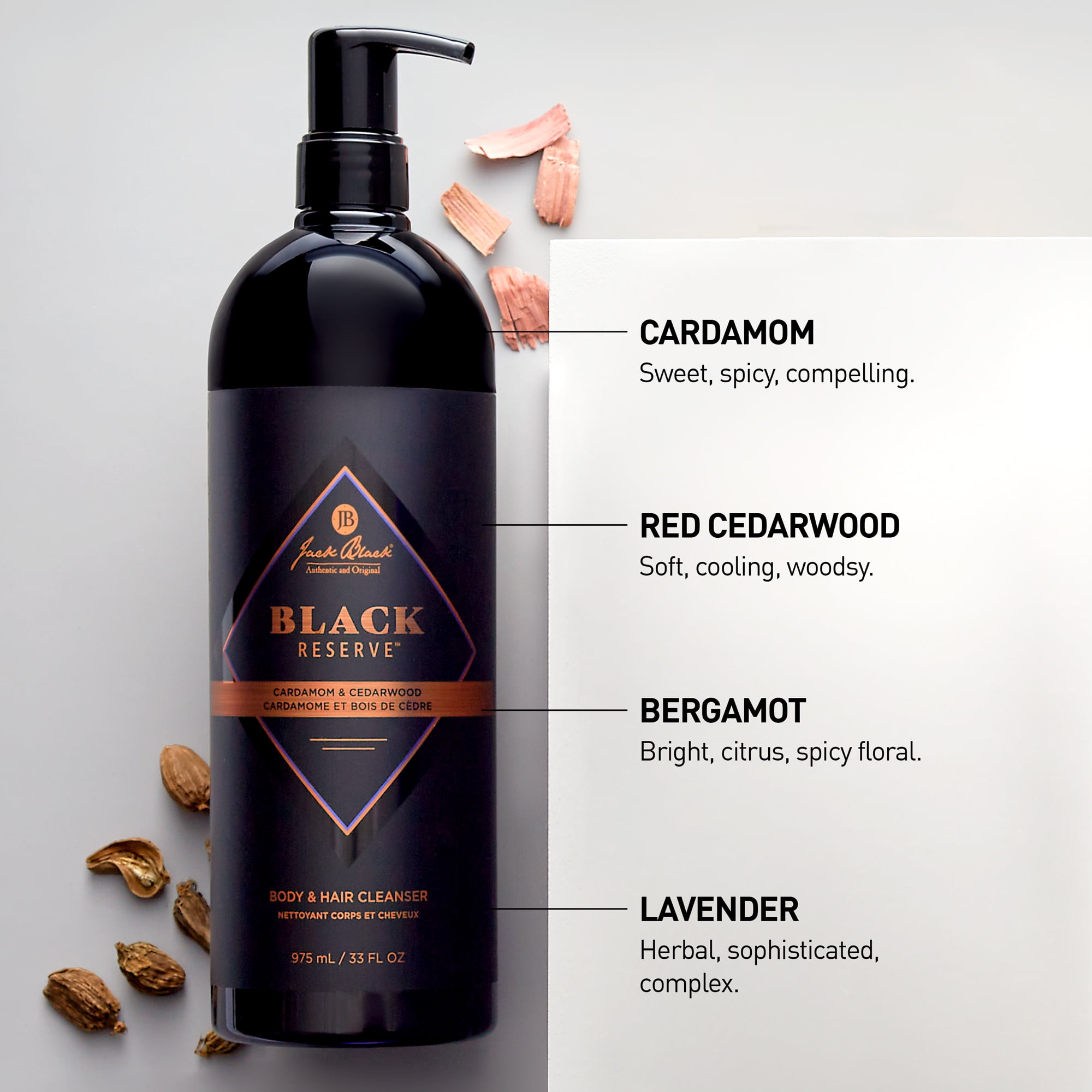 Created exclusively for the Jack BlackĀ® man, this dual-purpose, sulfate-free body and hair cleanser is an experience that leaves skin feeling clean without over drying. The aromas of Lavender and Bergamot soothe and relax, while Coriander and Patchouli add to the distinctive scent. A blend of natural, sulfate-free agents effectively cleanses the skin and hair without stripping essential moisture. Jack Black Reserve Body & Hair Cleanser, 10 fl oz.