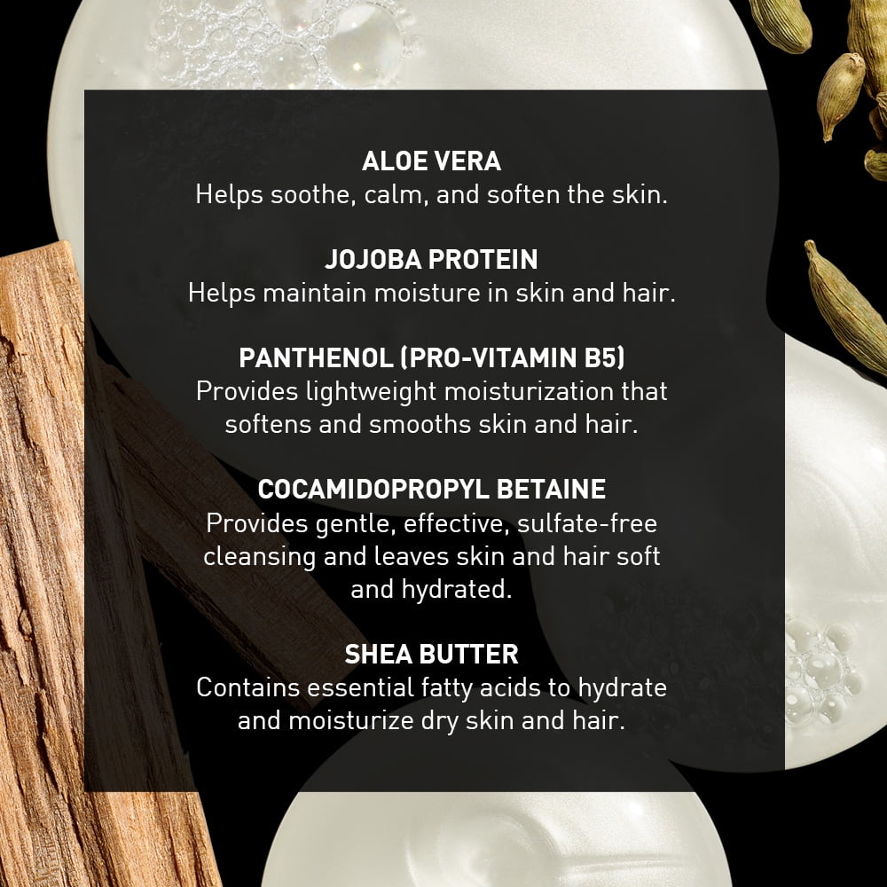 A blend of natural, sulfate-free agents effectively cleanses the skin and hair without stripping essential moisture.