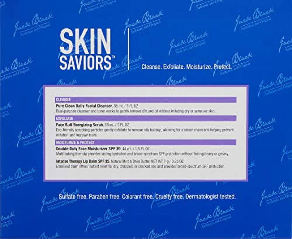 The Jack Black Skin Saviors set is a 4-step regimen helps cleanse, exfoliate, moisturize and protect skin with essential daily care in TSA-approved travel sizes. The set starts with a 2-in-1 liquid cleanser and toner to remove deep-down dirt and oil for clear, smooth skin. A gentle facial scrub exfoliates and preps skin for an easier shave. A lightweight moisturizer with broad-spectrum SPF 20 hydrates and defends against sun damage. A mint-scented lip balm with SPF 25 soothes and relieves dry, chapped lips. Dermatologist tested and formulated without sulfates, parabens, or colorants, this kit is perfect for daily routines at home or on the go.