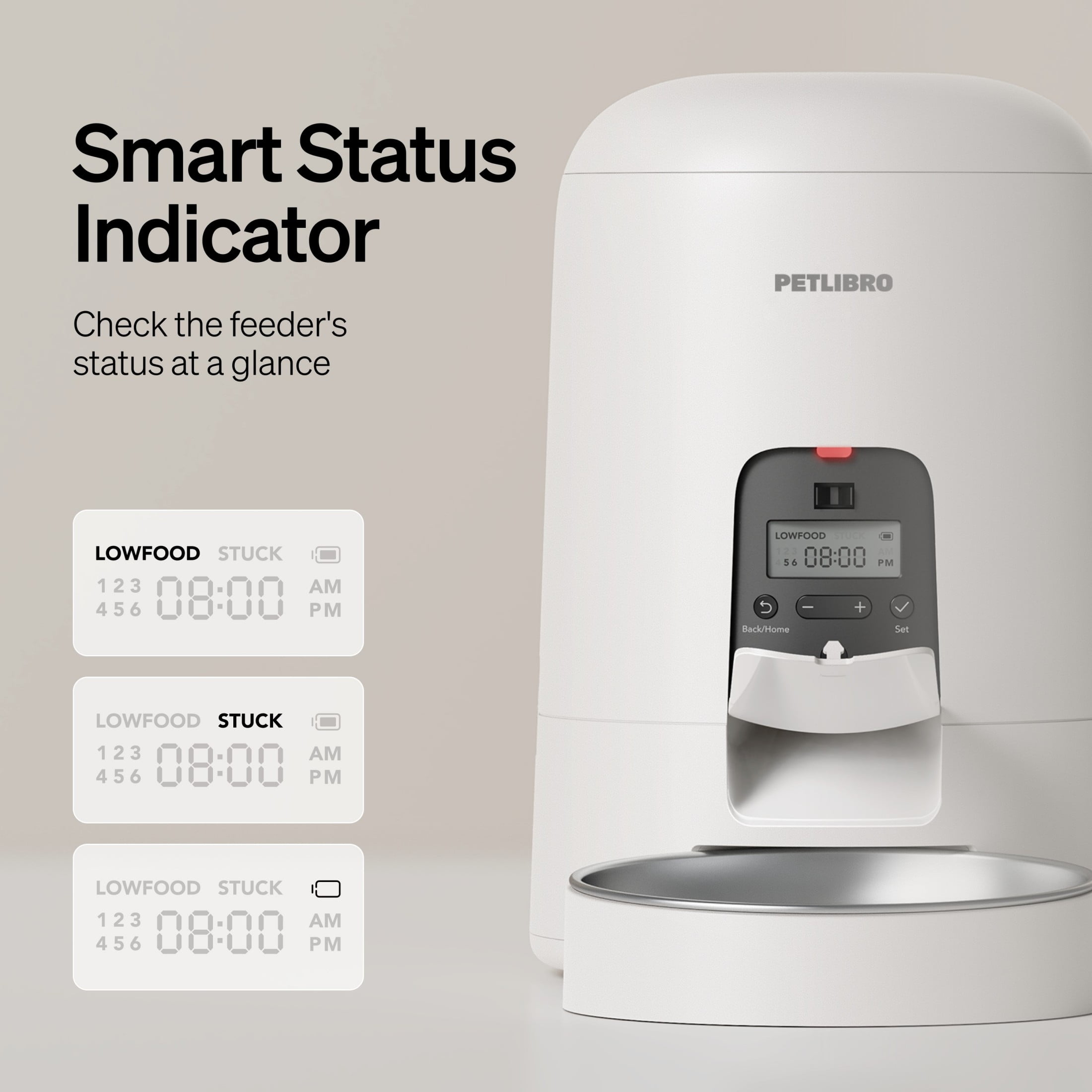 - Smart Low Food Alerts: A flashing red light and “LOW FOOD” message remind you when it’s time to refill. Plus, the feeder alerts you to food jams and low battery, so your pet never misses a meal.