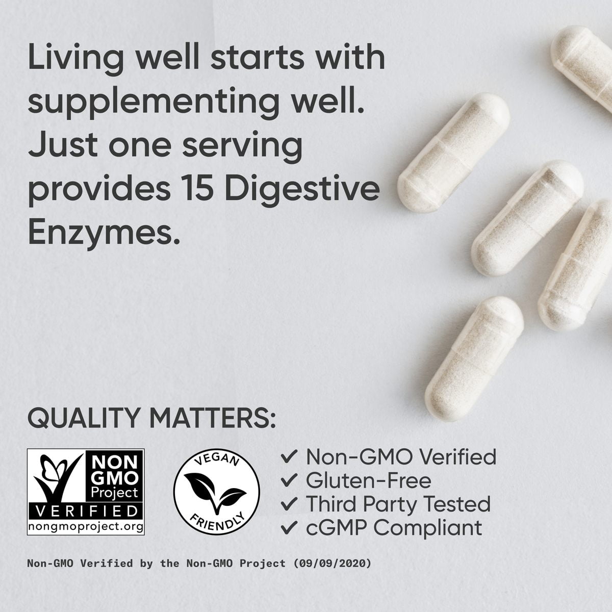 - QUALITY ASSURED: We hold all of our supplements to a higher standard. Rest assured that your digestive enzymes capsules are manufactured in a cGMP-compliant USA facility and third-party tested for quality. Our digestive enzymes capsules are Non-GMO Project Verified, Vegan Friendly, and free of gluten, soy, and unwanted fillers