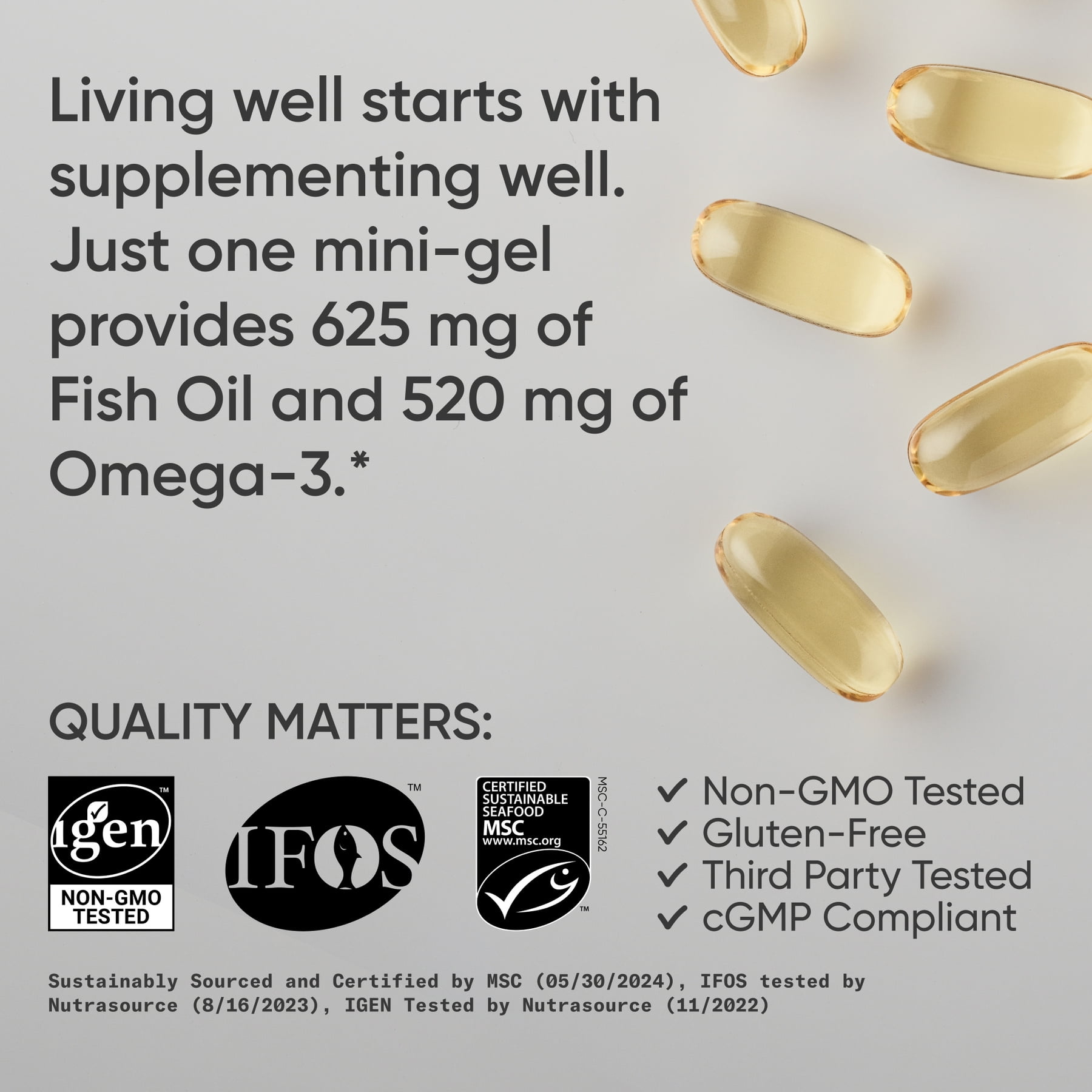 WHAT’S INSIDE – EASY MINI GEL: Each pescatarian-friendly mini softgel delivers 625mg of fish oil, providing a concentrated 520mg of Omega-3 fatty acids in the preferred triglyceride form—with balanced levels of EPA and DHA. This smaller, easier-to-swallow gel makes it simple to meet your daily omega-3 needs without the bulk of oversized capsules or multiple doses.*