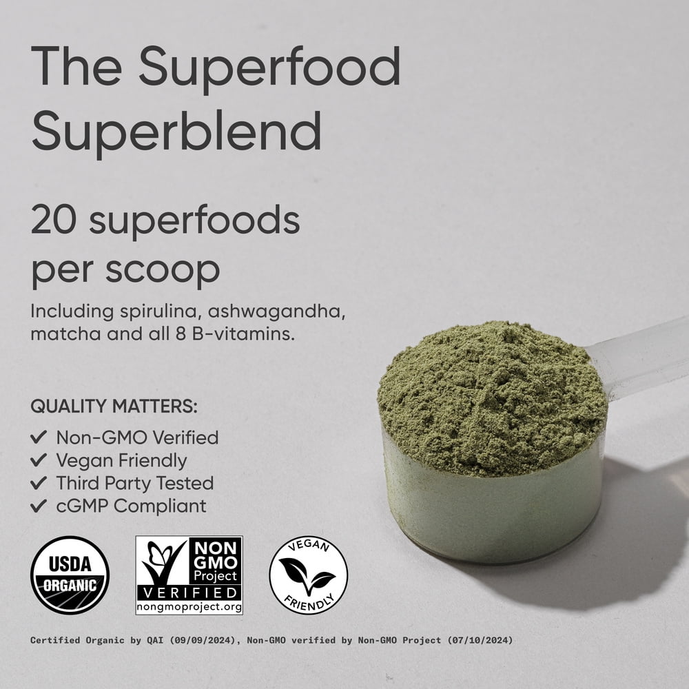 - ADAPTOGEN, ENERGY & ENZYME SUPPORT: 1 scoop contains over 20 organic superfoods including spirulina and ashwagandha to support digestion, energy levels, and mood. Both flavors are enhanced with organic stevia for a sweet way to start your day.*