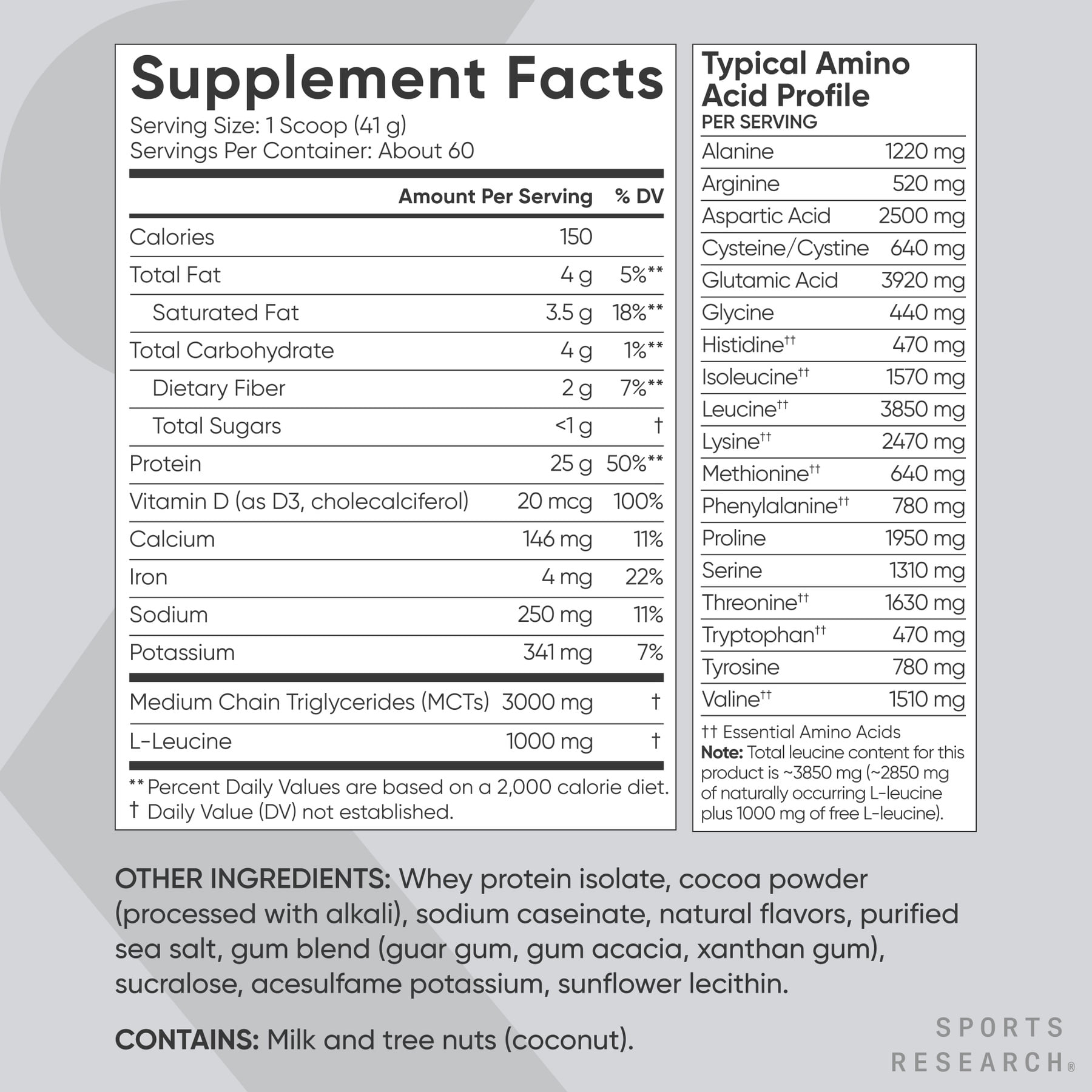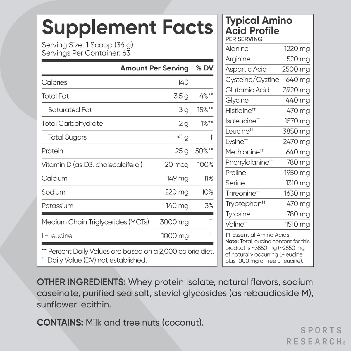 Get ready for premium protein that’s also decadently delicious! Sports Research® Whey Protein is packed with 25g of protein, 6.9 g BCAAs and 1000 mg added L-leucine to help build and maintain lean muscle and support workout recovery.*▲ With 3g of MCT powder and Vitamin D3, this protein has everything you need and nothing you don’t. ▲When taken in conjunction with a healthy diet and exercise routine.